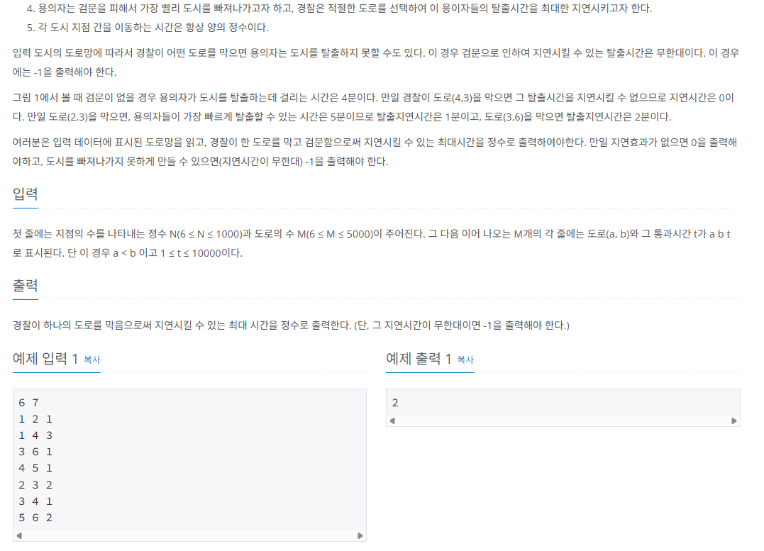 간선을 하나씩 제거했을 때 파악을 해야하는데 처음에는 이 부분을 최적화하는 방법을 몰라서 간선 5000개를 다 지워보면서 전부 다익스트라를 돌려보았다.