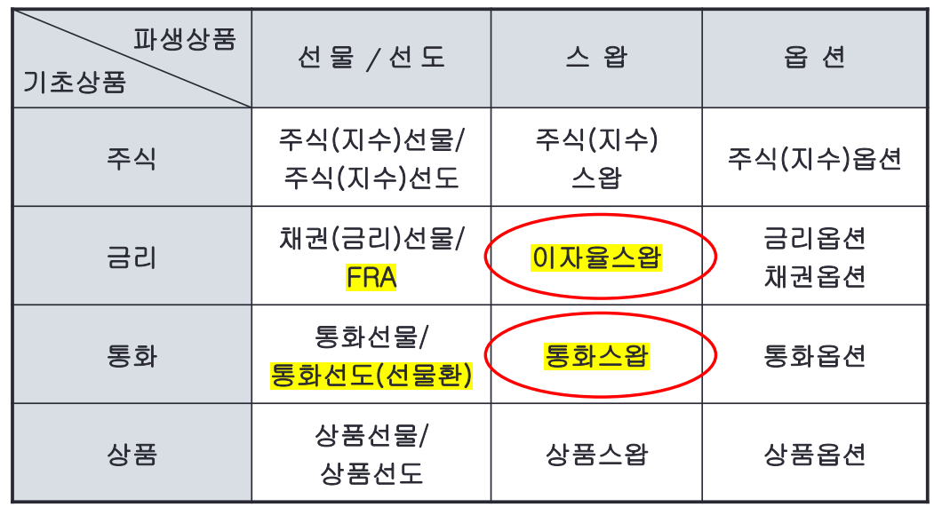 스왑에는 이자율스왑과 통화스왑, 지수스왑과 상품스왑이 있다.