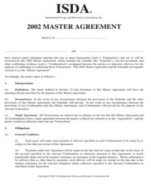 국제스왑 파생상품협회(ISDA)는 스왑계약 당사자에게 두루 통용될 수 있는 기본 협약서(Master Agreements)를 개발해 놓았다.