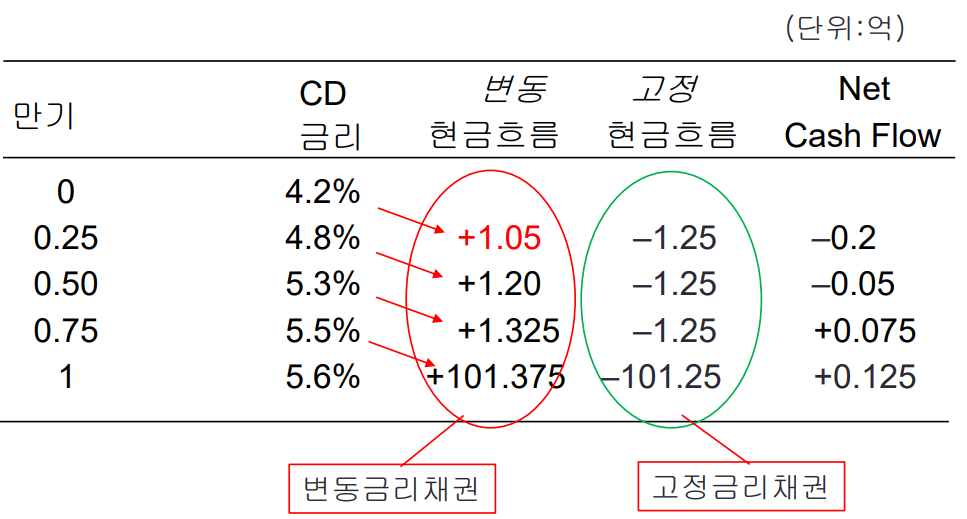원금 100억, 고정금리 5% 지급, 변동금리 수취 (원금교환을 가정)