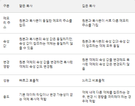즉, 객체의 속성 값 자체를 복사하는 것이 아니라 속성값이 저장된 메모리 주소를 복사 하는 것