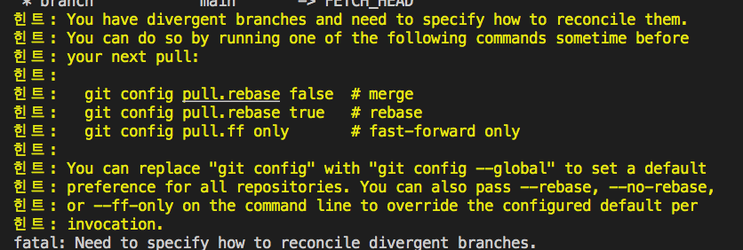 에러 설정은 git pull을 하라는 이야기인데, rebase, ff에 대해 검색하니 git merge로 이야기가 나와서 약긴 불편했었다.
