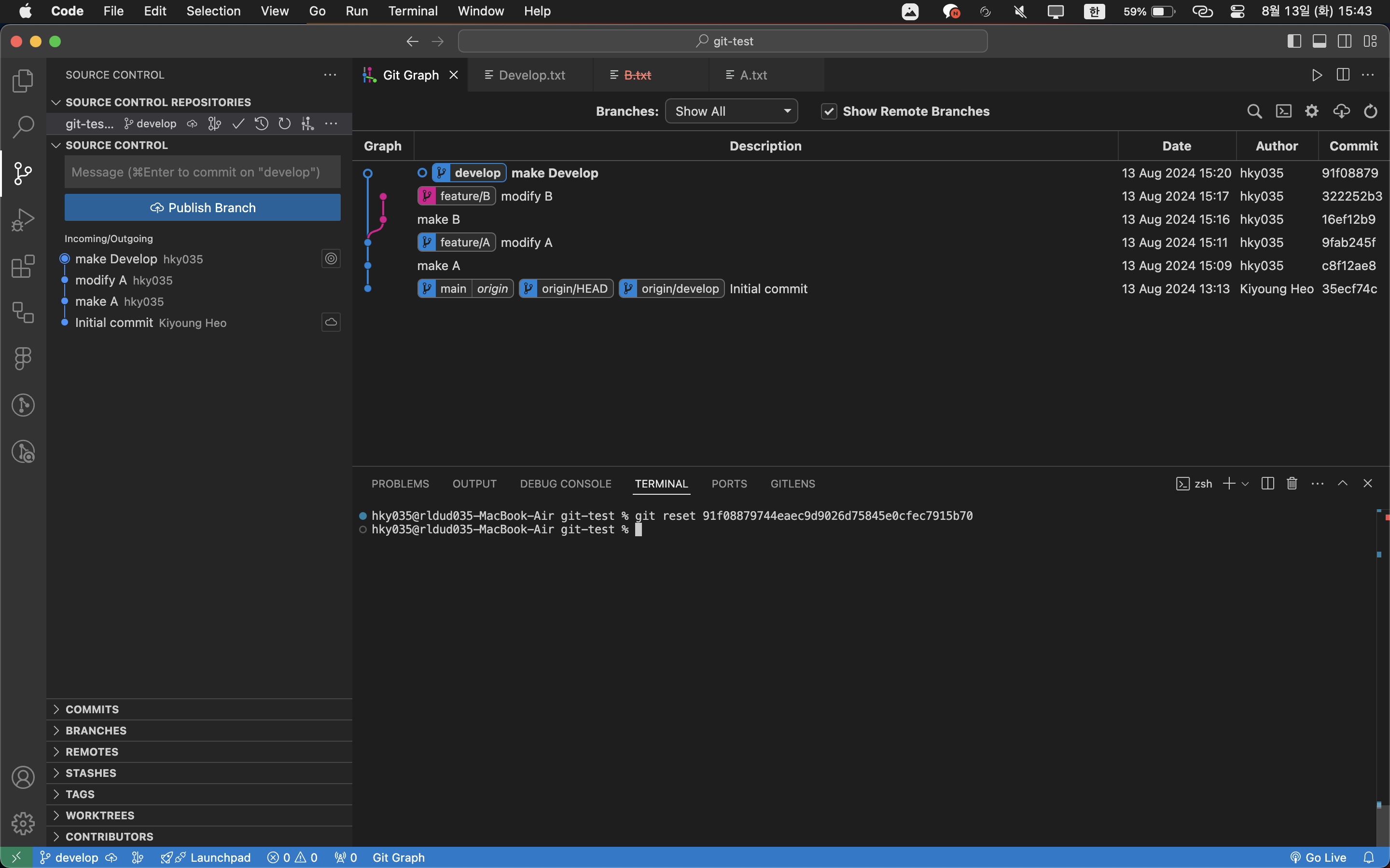develop에서 새로운 파일 Develop.txt를 만들면 git graph 분기가 생긴 것을 확인할 수 있다.