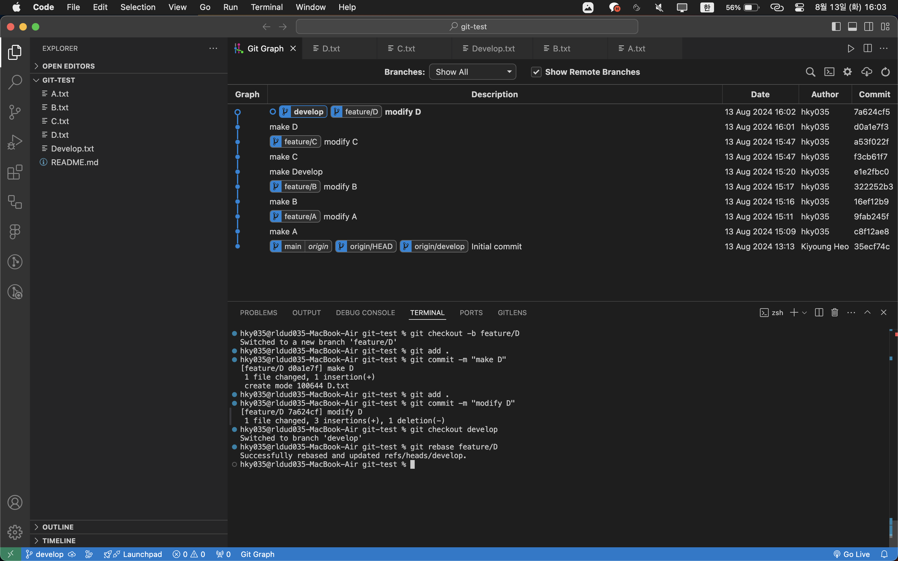 develop에 추가적인 커밋없이feature/D를 만들고(ff 관계) rebase를 테스트해보았다.