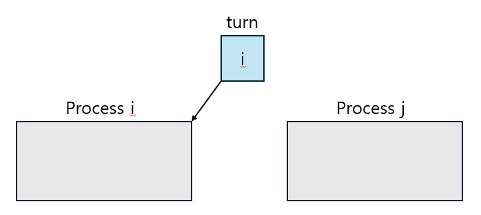 초기에 turn=i이므로 process i는 반복문을 실행하지 않고 임계영역에 접근한다.