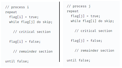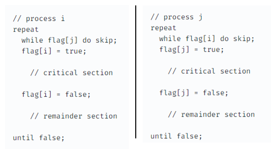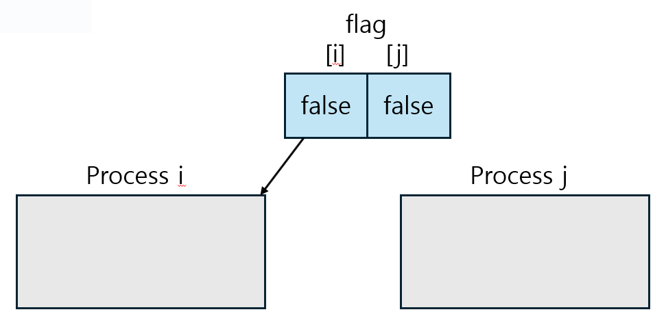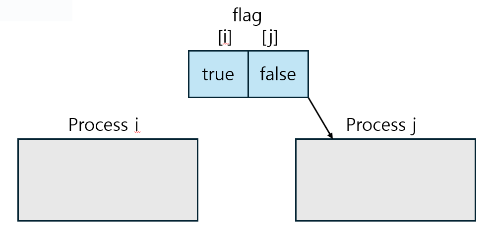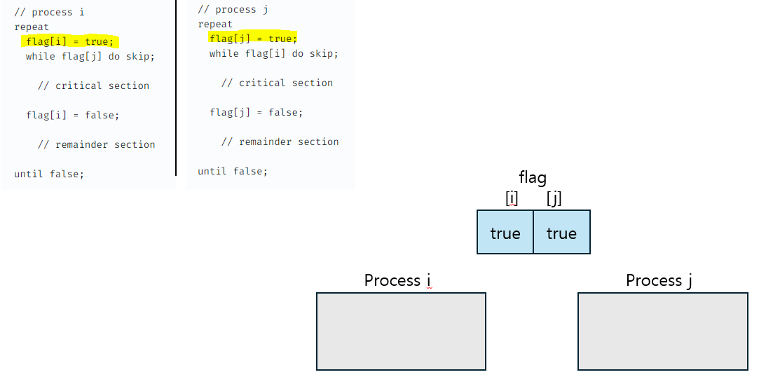 그러면 다음과 같은 상황일 것이다. process j가 실행되면 flag[i] == true이므로 while 반복문을 통해 무의미한 반복문을 반복해 대기하게 된다.