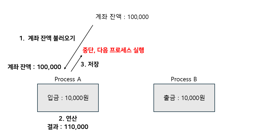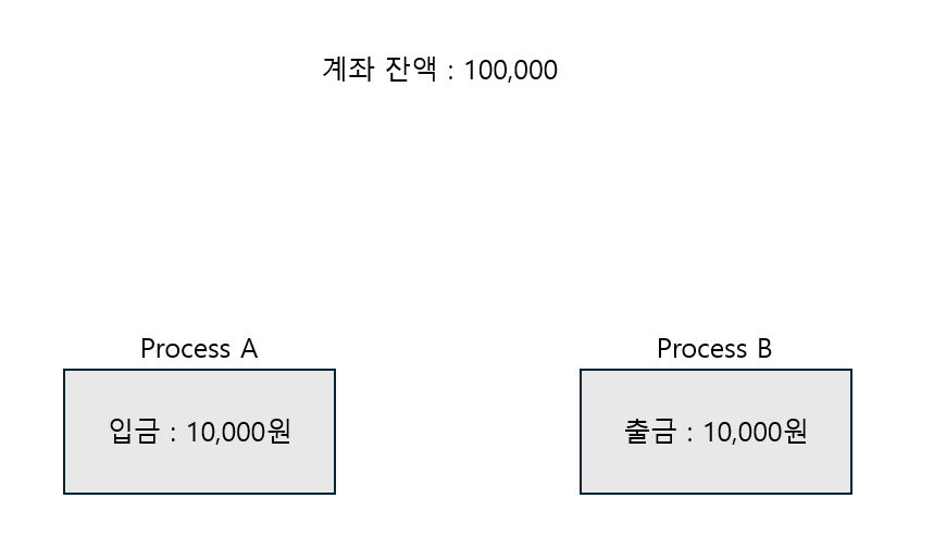 프로세스 A,B가 존재, 각 프로세스가 회사 계좌에서 돈을 입금/출금하려고 한다.