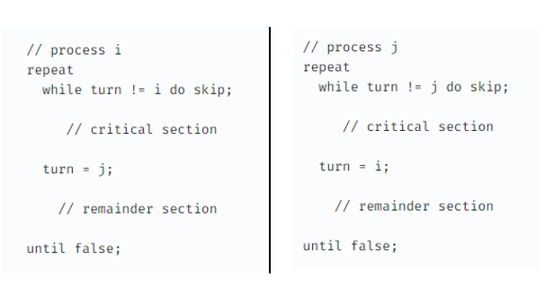 그러나, process j가 실행될 때 process i가 임계영역 내부에 있어 turn != j이면 임계영역에 접근하지 않음에도 불구하고 해당 프로세스는 while 반복문에 걸려 대기하게 되는 문제가 발생할 것이다.