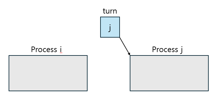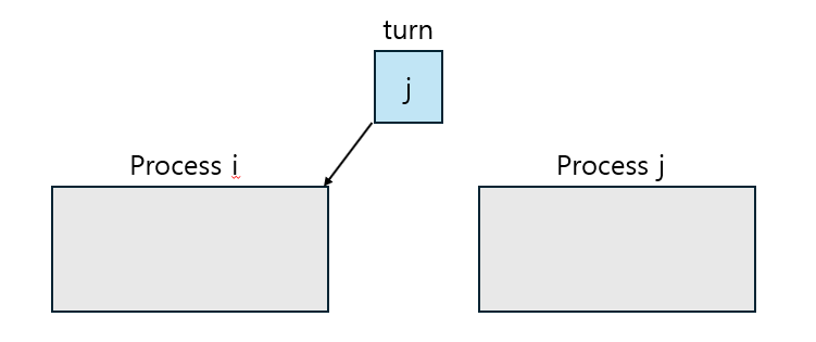 현재 turn=j이니 process j가 여전히 임계 영역 내부의 코드를 실행 중이었다는 상황이다.