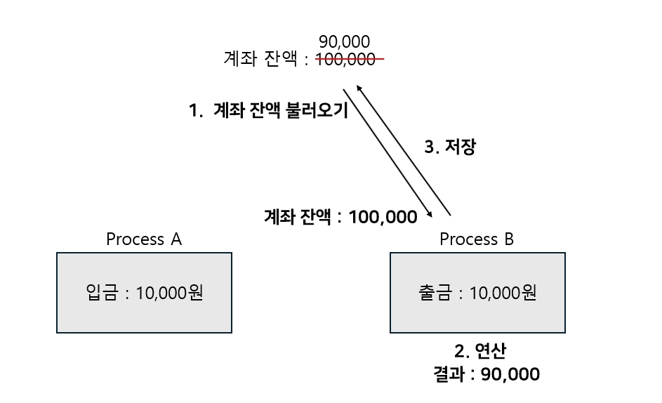위의 상황에서 계좌 잔액이 한 프로세스에 의해 업데이트가 되기 전에 해당 공유 변수(잔액)에 접근하여 문제가 발생하였다.