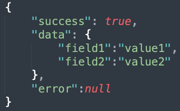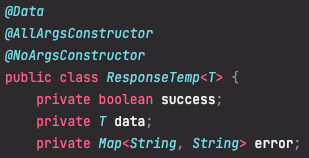 "success": 데이터가 요청한대로 응답했을 때(true)true 또는 false로 반환"data": 응답데이터를 담아주는 곳Generic Type으로 선언"error": 요청실패시 에러메시지 포함하여 응답null 반환: 데이터가 문제없이 응답했을 경우{