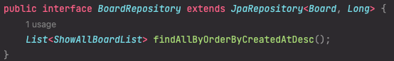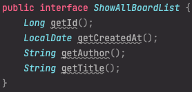 중요!!!__ Interface에는 getter method만을 만들어주고, 이 method는 Aggregate root(여기서는 Board Class)의 것과 동일해야한다.