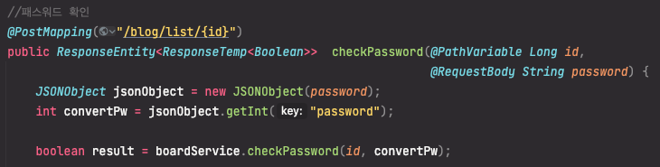 - 비밀번호를 입력 받아 해당 게시글의 비밀번호와 일치여부 판단하기