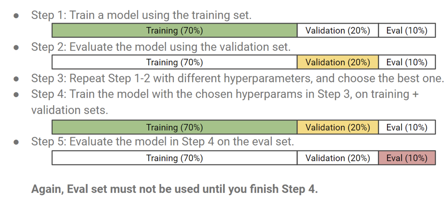 추가로 validation set 을 따로 뺀 후에 이를 hyperparameter 를 튜닝하는 데에 사용한다.