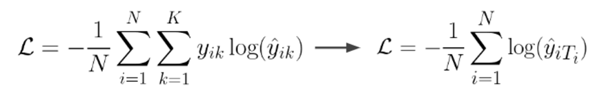 이때 를 i번째 샘플의 ground truth 인덱스라고 하면 결국 오른쪽 식처럼 정답인 클래스에 대해서만 예측값이 남는다. 따라서 N개의 샘플에서 클래스 T에 속할 로그 확률을 평균 내는 것과 동일하다.