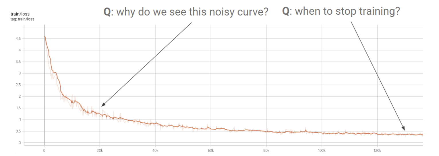 이렇게 train loss를 구해보면 smooth 하지 않고 noisy 하게 나온다. 그 이유는 바로 stochastic 하기 때문. 랜덤으로 mini batch 사이즈만큼 샘플링을 하고 로스를 계산하는 것이므로 일정한 방향으로 로스가 계속 감소하는게 아니라, 어떨 때는 다시 올라가기도 한다. 따라서 언제 train을 멈춰야 하는지 잘 고려해서 알고리즘을 짜야 한다.