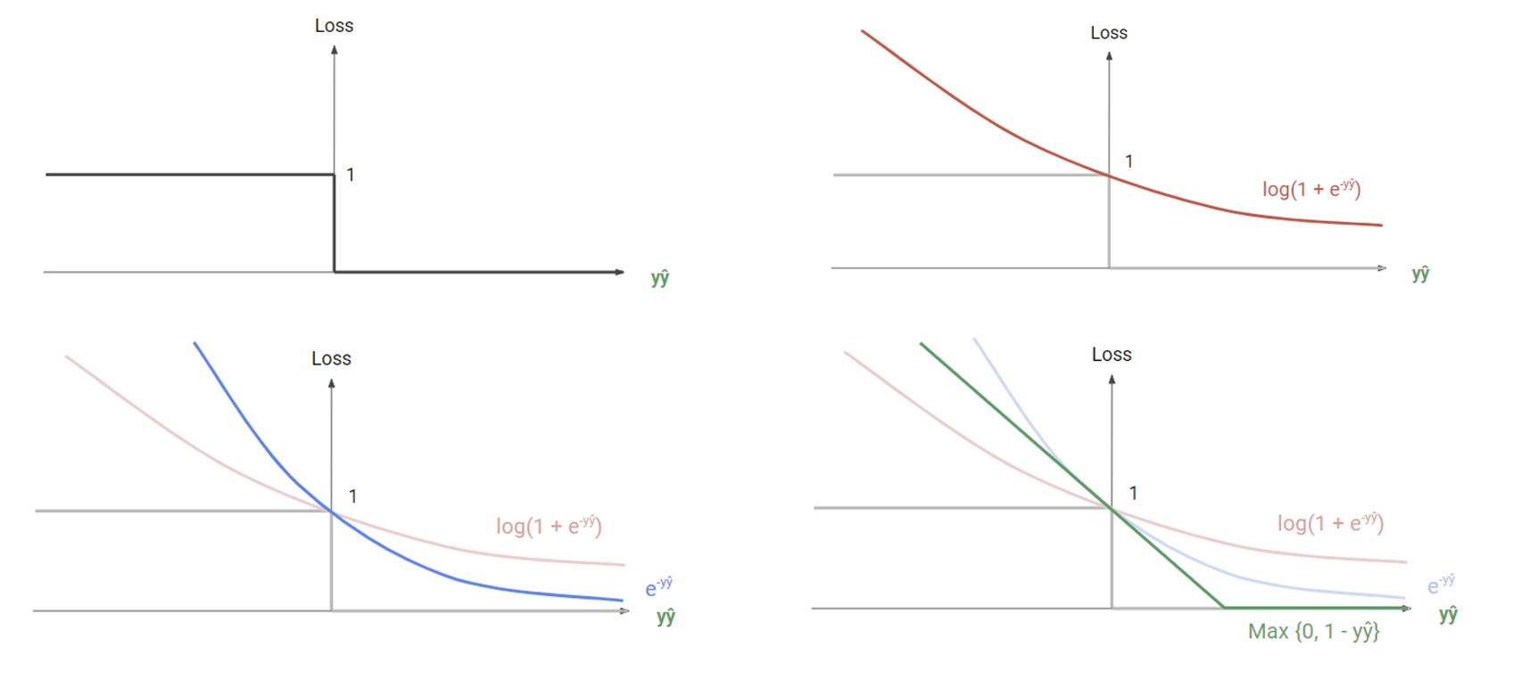 위에 부터 0/1 loss, Log loss, 아래에 Exponential loss, Hinge loss 함수이다. 하나씩 어떤 성질을 가지고 있는지 알아보자.