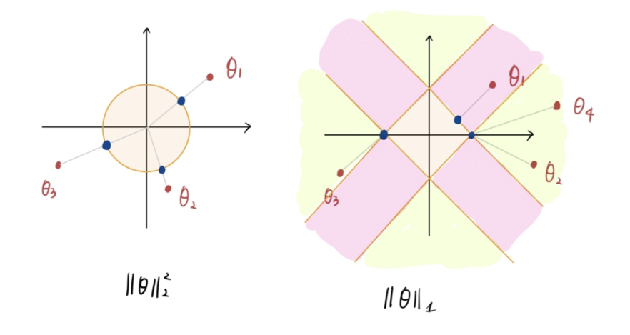 왼쪽 Ridge Regression을 보면 세타가 원 밖에 있으면 쉽게 윈 위의 점으로 매핑시킬 수 있다. 즉, 원 밖의 점은 원 위 모든 점으로 매핑가능하다는 말이다.