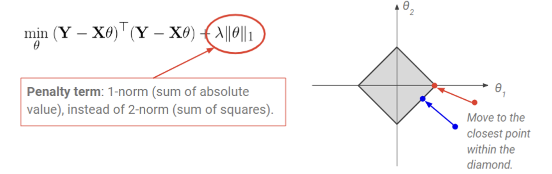 이번에는 regularization term이 세타에 절댓값을 취해 모두 더한 값이다. 그럼 가 가질 수 있는 값의 영역은 마름모 꼴이 된다. 근데 여기서 잘 생각해보면 Ridge Regression과 다른 점이 하나 있다.