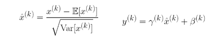 여기서는 새로운 파라미터 를 둬서 학습으로 이 값을 얻게끔 한다. 이렇게 예쁘게 normalized 를 시켜도 ReLU만 지나면 음수인 부분은 모두 0으로 매핑되어 버린다. 따라서 와 로 Scaling과 Translate를 시켜주려는 목적이다. 이때 어떻게 transform 시킬지는 모델이 알아서 적절히 학습할 것이다.