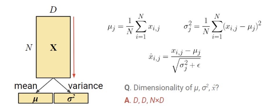 N개의 샘플이 들어왔을 때 전체에 대한 평균과 분산을 구하고 x를 normalize 시켜주면 된다. 어려운 것은 없다.