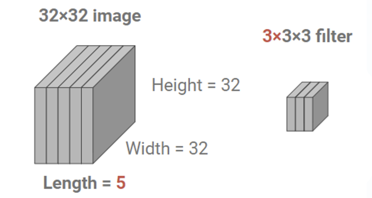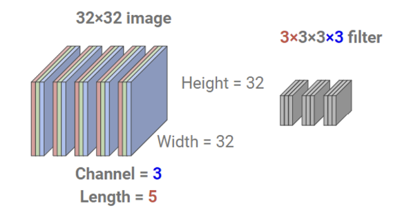 channel = 1인 5장의 이미지가 있다고 하자. 이때 시간축을 length라 표현하고 표기할 때 제일 앞에 쓰기로 하면 이 이미지는 5 32 32로 표현할 수 있다. 이때 필터는 3 3 3, 즉 3개의 이미지씩 묶어서 본다고 하면 연산이 어떻게 되는지 보자.
