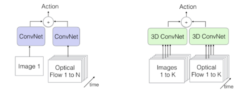 왼쪽이 Two Stream 모델이었다. 이미지와 optical flow를 한 장의 이미지로 취급하여 2D ConvNet에 입력으로 주는 방식이었다. I3D는 그와 다르게 spatio 와 temporal 모두 3D ConvNet 을 사용한다.