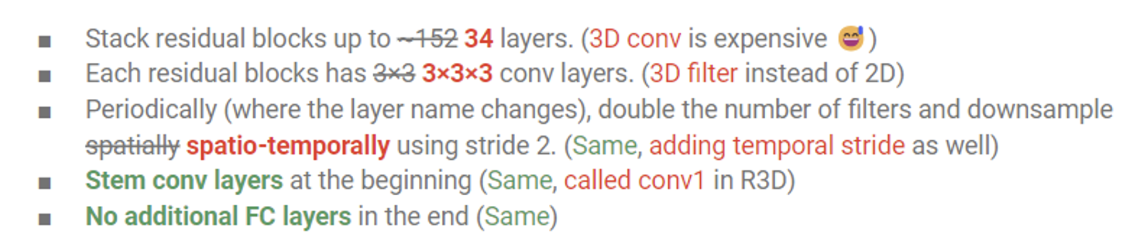 ResNet 2D에서 3D로 넘어가면서 변경된 부분들을 빨간색으로 표시한 것이다. 보면 아무래도 동영상을 다루기 때문에 연산량이 많이 레이어를 깊게 쌓는게 불가능하였기에 34층으로 줄였다. 그리고 당연히 필터에도 temporal 축을 추가했다. 그 외에는 명칭이 변하는 등의 minor한 변화들이 있었고, 나머지는 기존 아키텍쳐와 동일하다.