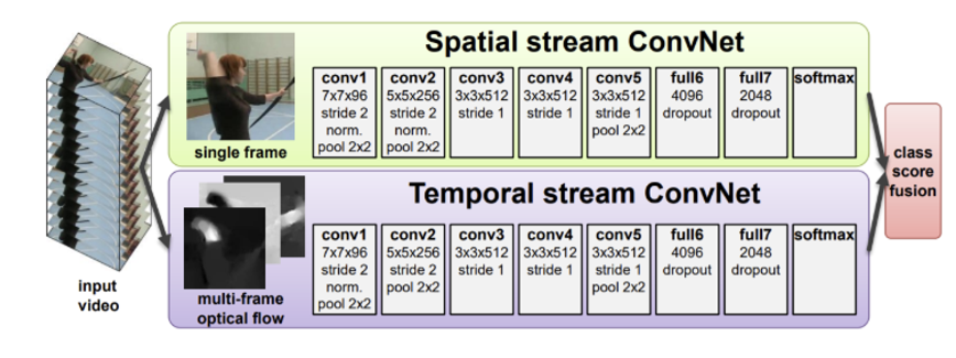 Spatio 로는 모든 프레임 중 랜덤으로 고른 한 장의 이미지를, Temporal 로는 모든 프레임의 optical flow를 층층이 쌓은 한 장의 이미지와 같은 데이터를 입력으로 준다.