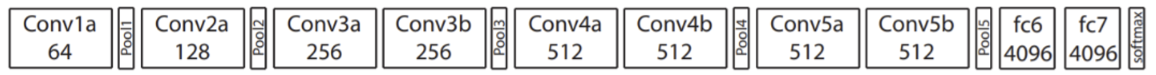 구조는 사실 AlexNet 과 거의 유사하다. 3D로 temporal 축만 하나 더 추가되었을 뿐, conv+pool 구조는 거의 비슷하다. 여기선 3 * 3 * 3 filter를 사용했는데, 즉 프레임 3개씩 묶어서 conv를 한다는 의미다.