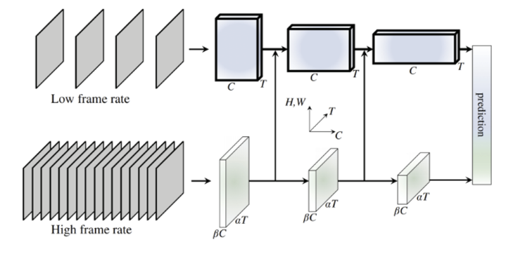 Spatio 정보를 학습하는 것과 거의 동일하다.Temporal 정보를 학습하는 것과 동일하다.근데 생각해보면 그럼 fast path에서 뽑는 프레임 수가 훨씬 더 많으니 연산량을 비교하면 엄청나게 차이가 날 것이며, 그럼 모델은 더욱이 이쪽에만 신경써서 학습할 것이다. 그걸 방지하기 위해 slow path 와 fast path 의 채널 수 를 다르게 하여 전체 연산량이 어느정도 비슷해지도록 조정을 했다.