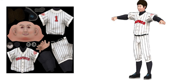 모델링 단계에서는 Polygon Mesh 를 만들어낼 뿐더러, 폴리곤 메시에 입혀질 'Texture'를 만들어냄. Texture 는 색깔이 들어간 이미지이며, 쭉 펴놓은 텍스처 이미지를 그래픽 디자이너가 일일이 픽셀 대응을 해서 폴리곤 메시에 안착시키면, 런타임 시에 폴리곤 메시의 표면에 입혀져서 제법 그럴듯한 영상이 만들어짐. 이러한 과정을 Texturing 이라고 함.