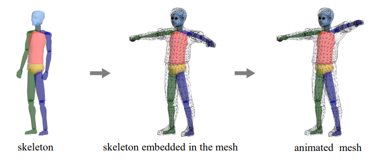 모델의 움직임을 표현하기 위해 여러 방법이 존재할 수 있는데, 가장 기본적인 방법은 모델이 움직일 수 있도록 폴리곤 메시에 'Skeleton' 또는 'Rig' 라고 불리는 골격을 사용하는 것임. Skeleton 을 폴리곤 메시 안에 집어넣고 폴리곤 메시와 잘 대응시키면 뼈의 움직임에 따라 폴리곤 메시도 같이 움직이게 됨.