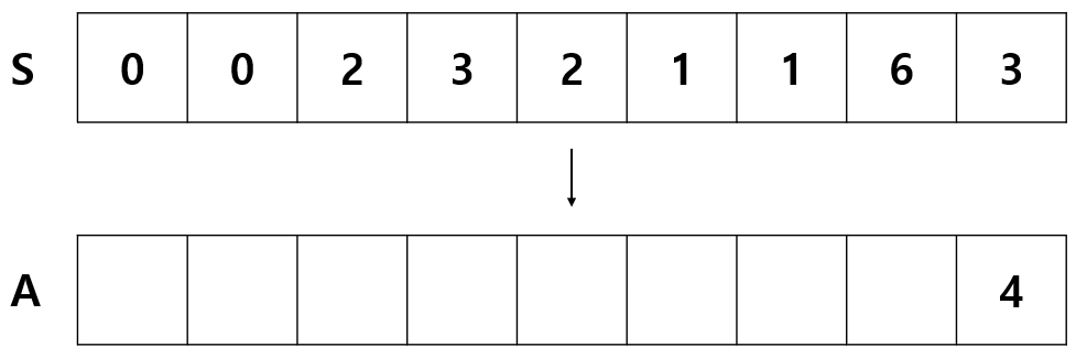 예를 들어 A 의 마지막 인덱스의 값은 4 이기 때문에 자신보다 좌측의 작은 수는 3 개 뿐이다.