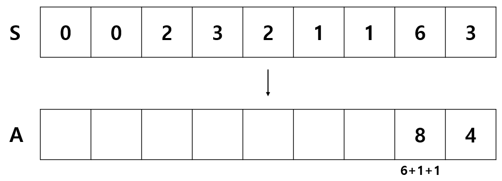 배열 S 는 A 의 각 인덱스 기준 좌측에서 자신보다 작은 수의 개수를 저장한다.