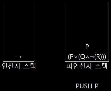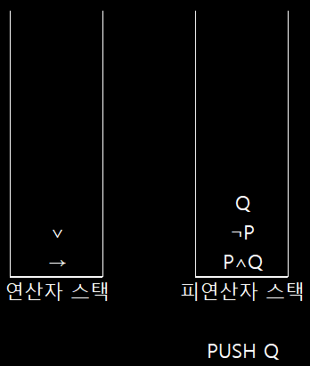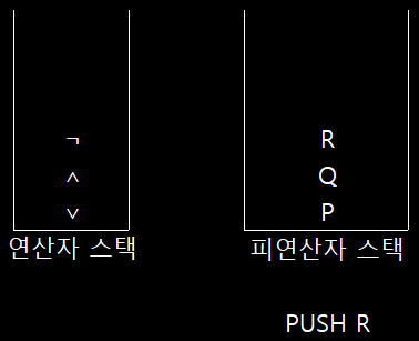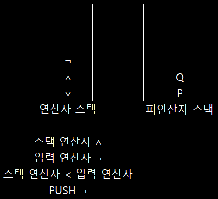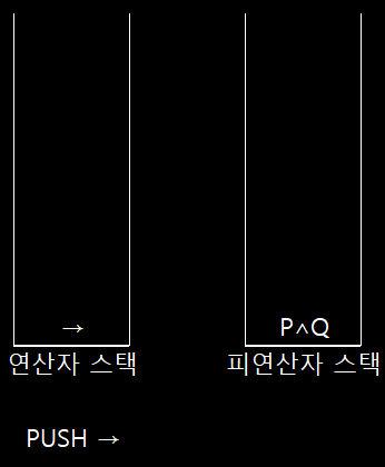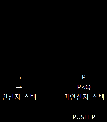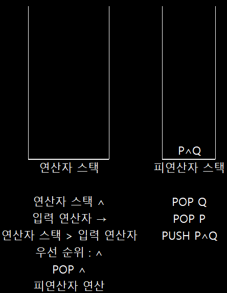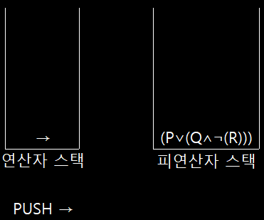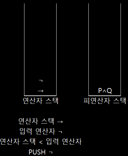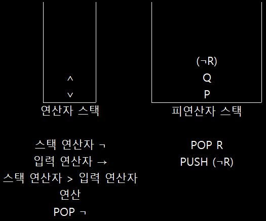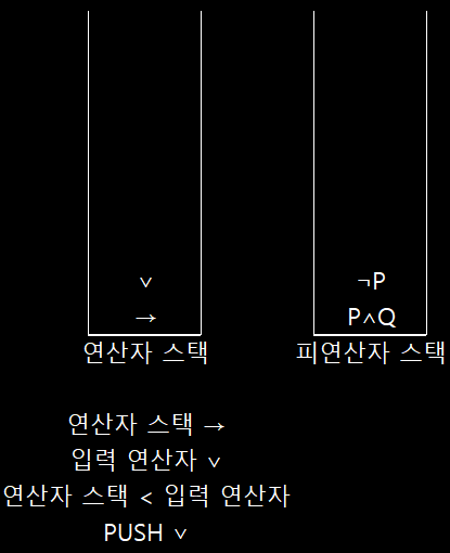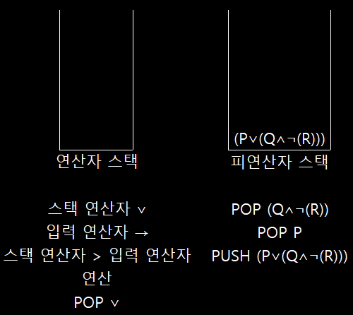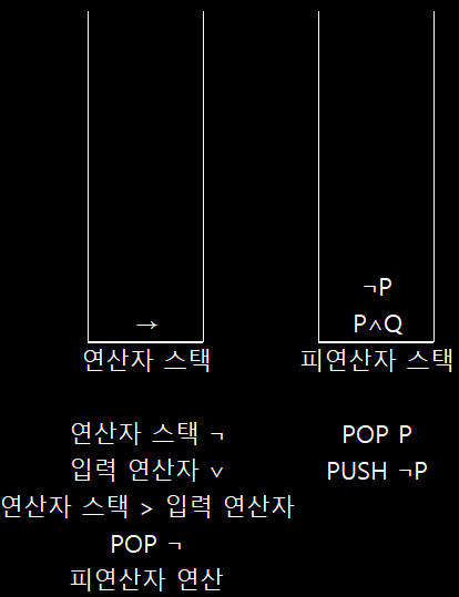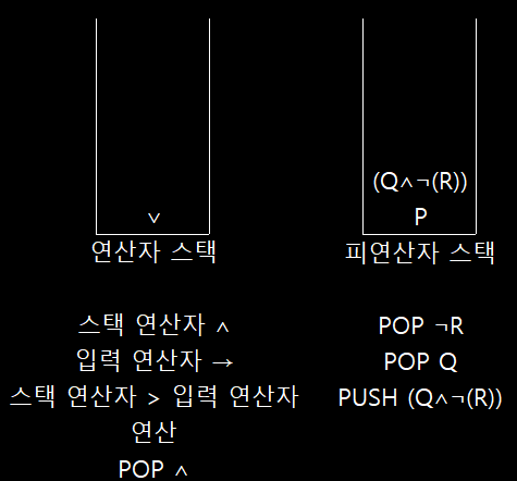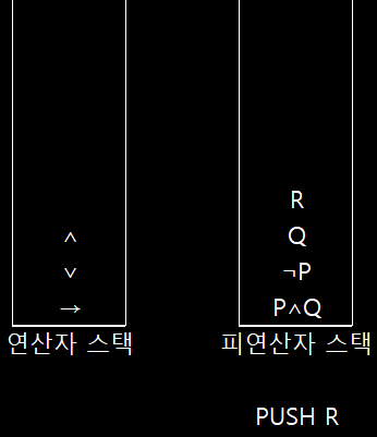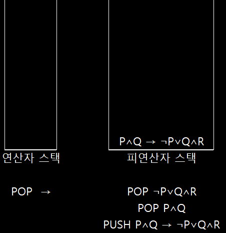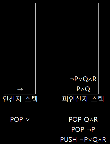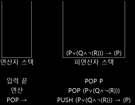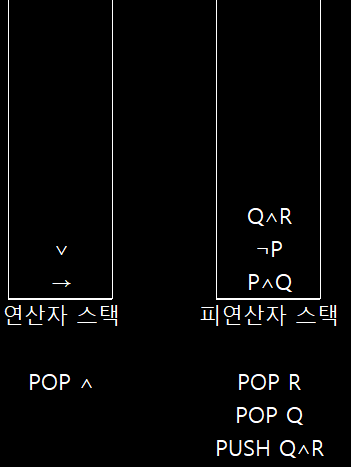 - 연산자 스택(¬,∧,∨,→), 피연산자 스택(P,Q,R)을 사용