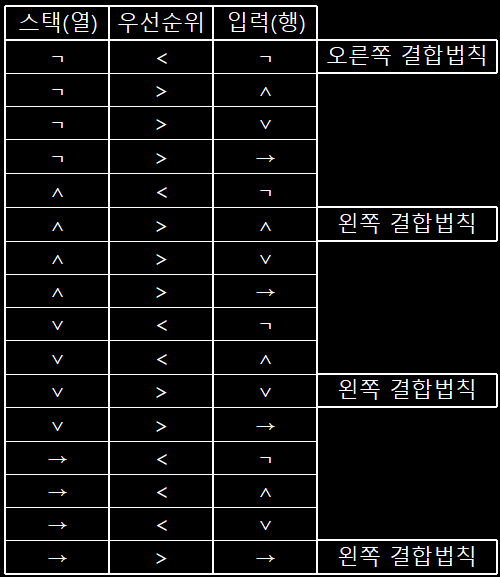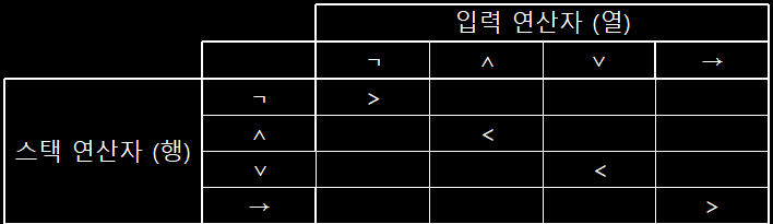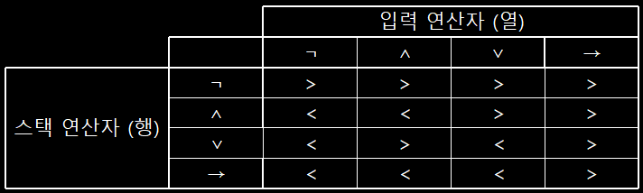 - 1행 2열을 보면 스택 속에 ¬ 연산자와 입력 속에 ∧ 연산자가 있는데 ¬ 연산자가 우선 순위이니 스택을 우선순위로 채울 수 있다.