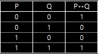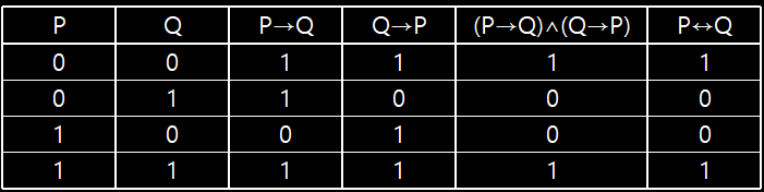 진리표를 보면 (P→Q)∧(Q→P)와 P↔Q가 똑같음을 알 수 있다.