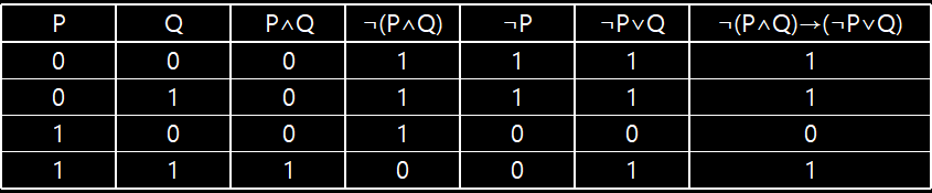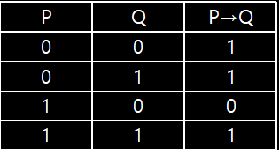 P가 1(참)이고 Q가 0(거짓)일 경우에만 0(거짓)이 되고, 그 외에는 모두 1(참)