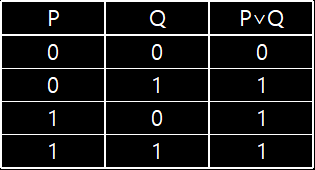 P 명제와 Q 명제중 1개 이상이 1(참)이면 논리합 P∨Q는 1, 나머지는 0
