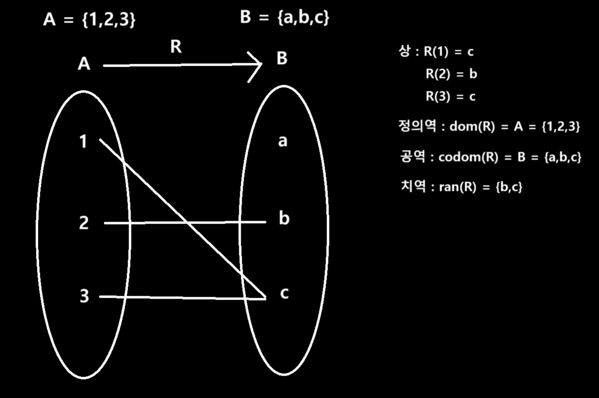 - 이항관계 R에 대해서 집합 A의 원소 a에 대응하는 집합 B의 원소 b를 상이라 정의