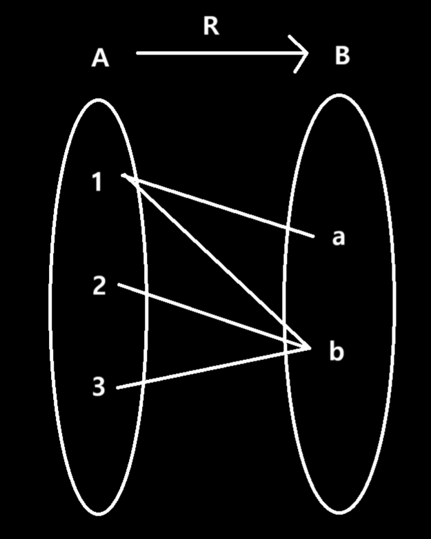 - 서로 다른 두개의 구역에 각각 A의 원소와 B의 원소를 써 넣은 후 R의 관계가 있으면 a로부터 B로 화살표를 그리는 방법