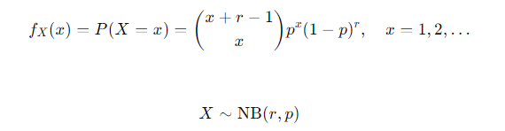 - 음이항분포 (negative binomial distribution) : 어떤 실험에서 성공확률이 p일 때, r번의 실패가 나올 때 까지 발생한 성공 횟수 X의 확률 분포