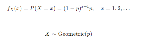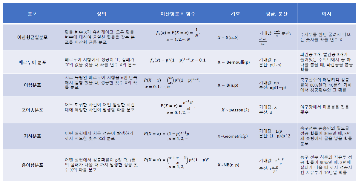 - 기하분포(geometric distribution) : 어떤 실험에서 처음 성공이 발생하기까지 시도한 횟수 X의 분포. 이 때 각 시도는 베르누이 시행을 따름.