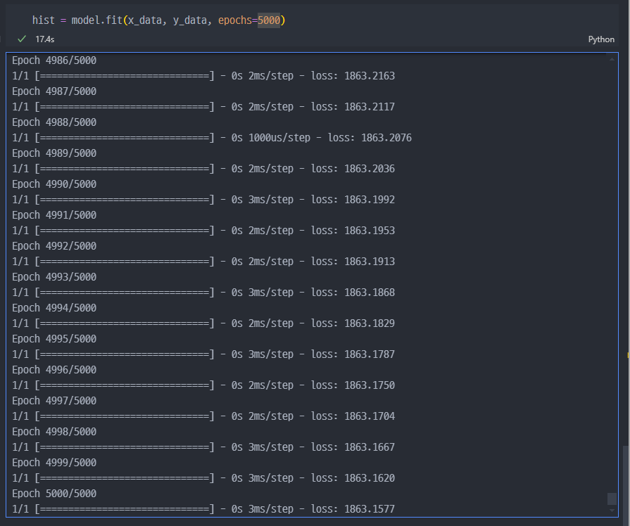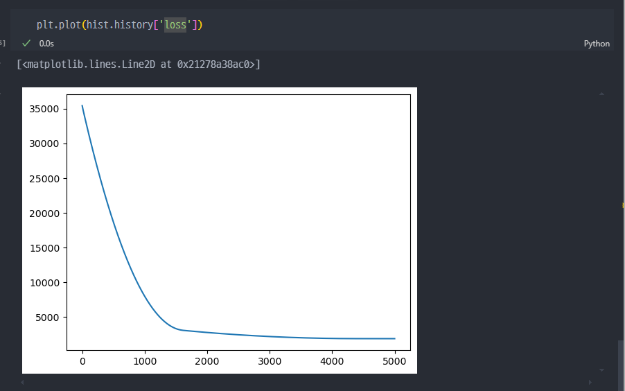 loss를 약 1800까지 떨어트린다 ( 학습횟수를 증가시키므로 loss를 줄이는 효과, 현재 5000번 학습 )