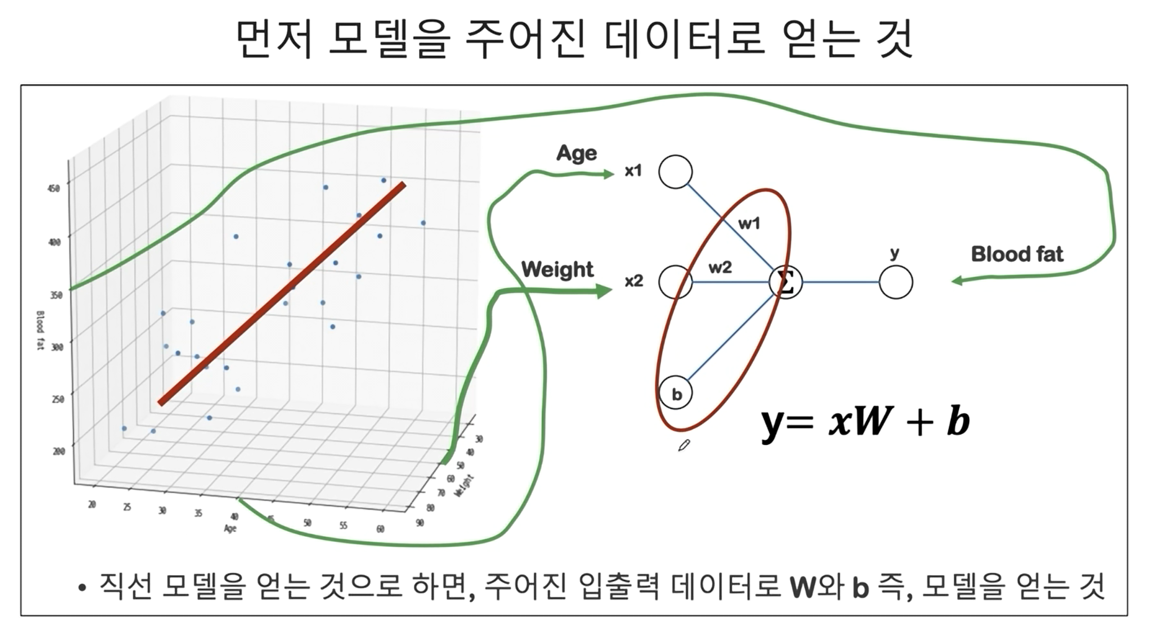 현대 간단한 딥러닝의 목표는, 나이와 몸무게를 알려주면 주어진 데이터를 분석하여