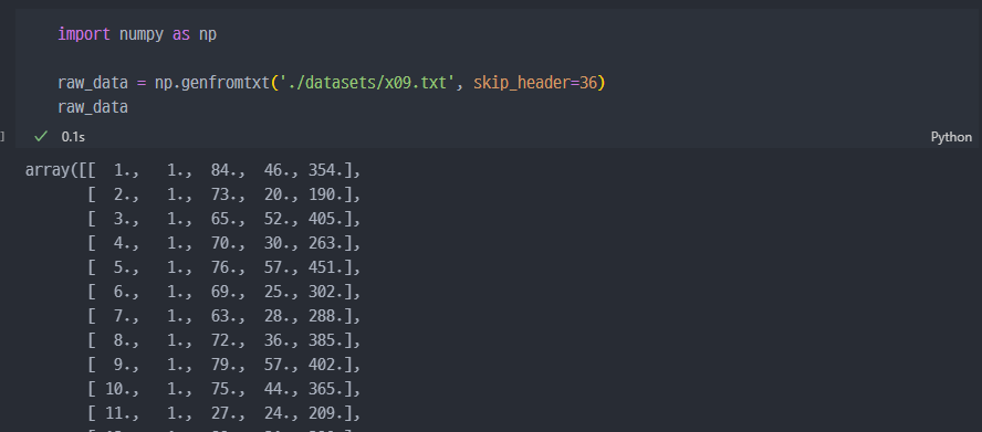 index, 두번째는 그냥 구분선, 몸무게(kg), 나이(age), blood fat content 순서로 구성되어 있음.