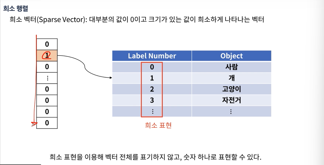 행렬에서 하나의 값만 1이고 나머지 0인 경우 모든 값을 표현하기에는 메모리 소모 발생.