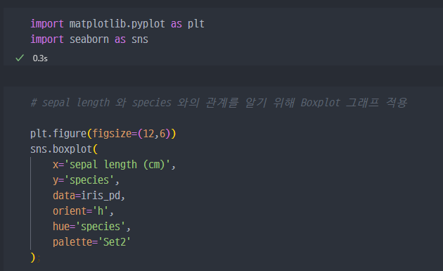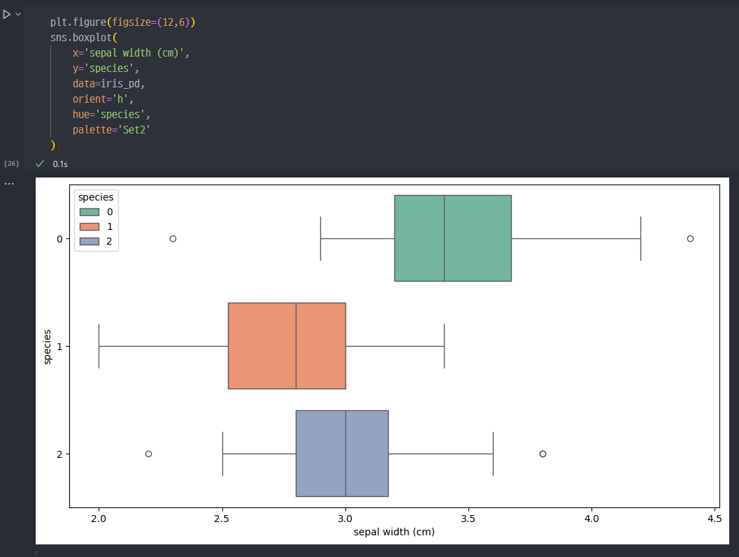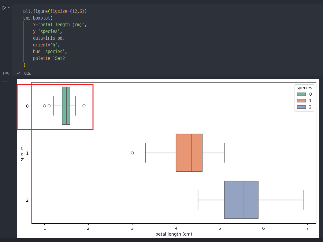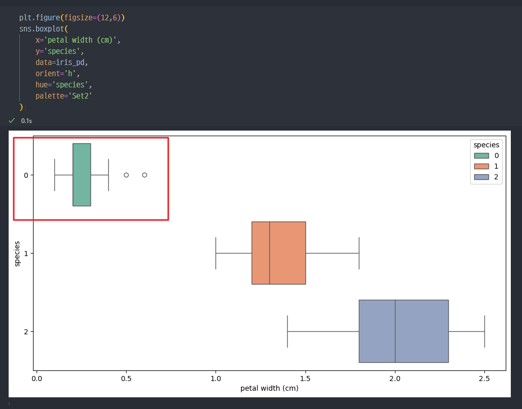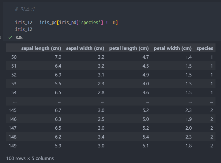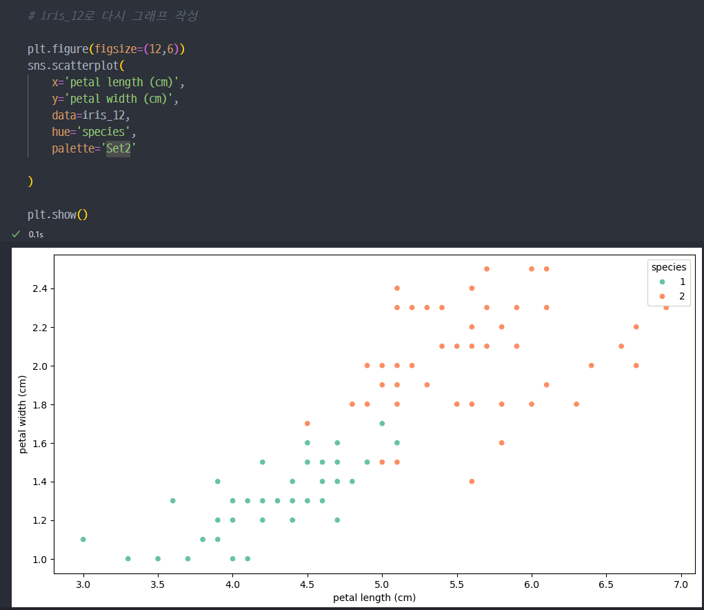 - species 가 0 인 Setosa는 제외하고, 나머지 품종에 대하여 마스킹, iris_12로 데이터 정의