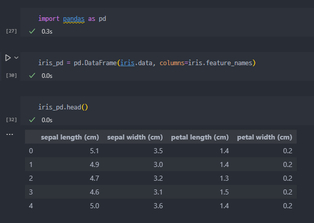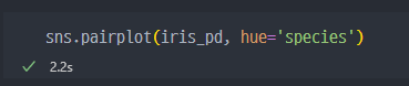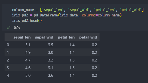 - pandas를 통해서 IRIS 데이터를 DataFrame으로 변경. 여기서 컬럼은 기존 데이터 활용하여 지정